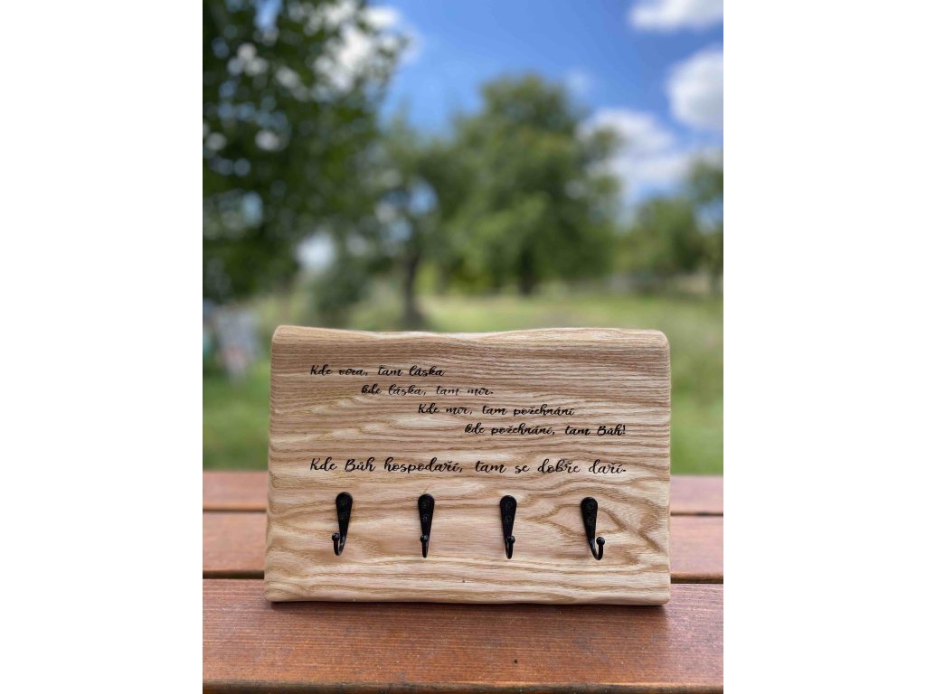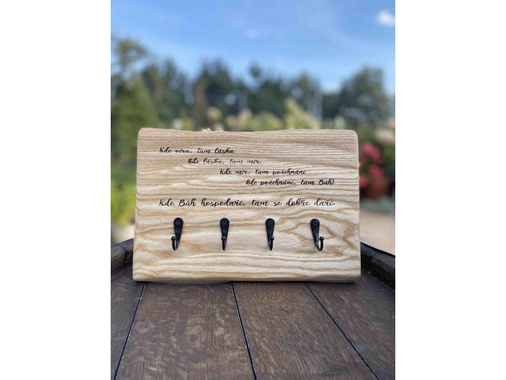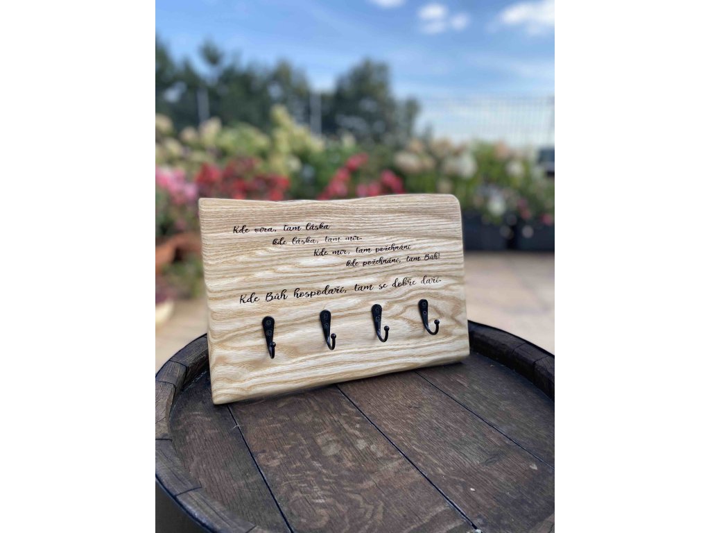 Originální dřevěný věšák na klíče z masivního jasanového dřeva, který spojuje praktičnost s hlubokým poselstvím. Přední stranu zdobí gravírovaný citát: